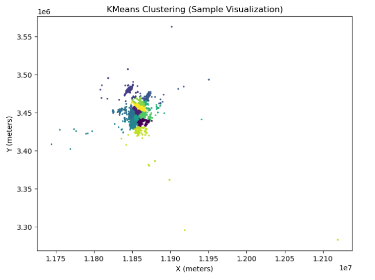 X_proj = np.array([transformer.transform(lat, lon) for lat, lon in coords])转换后的 X_proj 是一个形状为 (2423753, 2) 的数组,单位为米,可直接用于 K-Means 聚类。