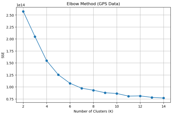 为了确定合适的聚类数量,我们分别对 K=2 到 K=14 训练 Mini-Batch K-Means,并记录每个模型的 SSE(Inertia)。绘制 SSE 随 K 变化的曲线,寻找“肘部“位置。